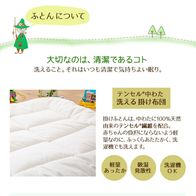 ムーミンと仲間たちがデザインされた、北欧テイストのお布団セットです。お子様の眠りを彩ります。