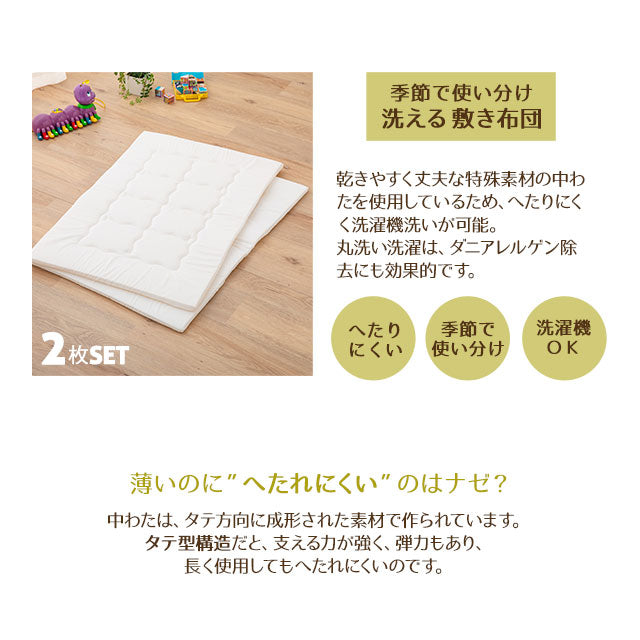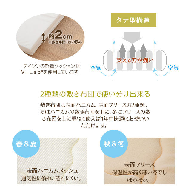 敷き布団はハニカムとフリースの2種類入り。季節に合わせて使い分け、一年中快適に過ごせます。