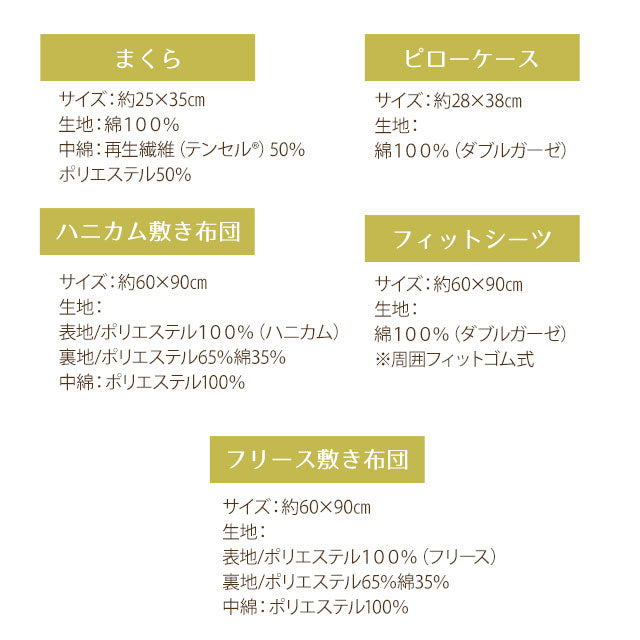 フィットシーツ | 約60×90cm生地:綿100% (ダブルガーゼ) ※周囲フィットゴム式 | ||