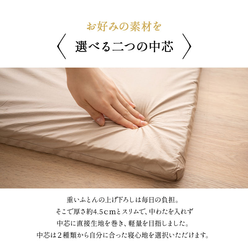 自分好みの寝心地を選べる2種類の中芯は、軽量設計で扱いやすく、固わたやチップウレタン仕様も選択可能です。