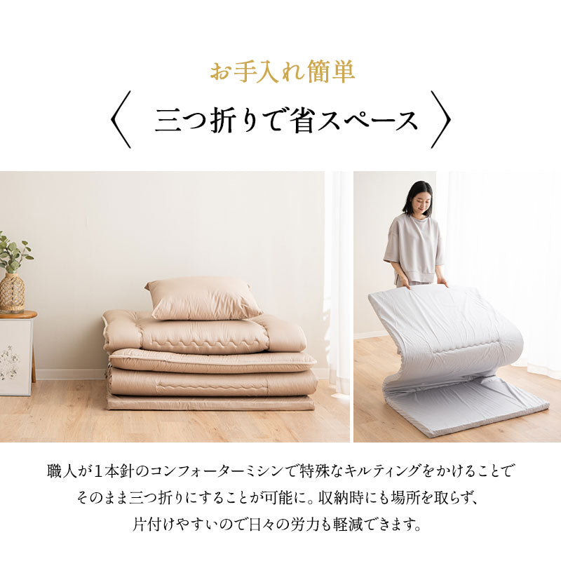 三つ折りできる特殊キルティング仕様でコンパクト収納が可能、日々のお手入れも簡単です。