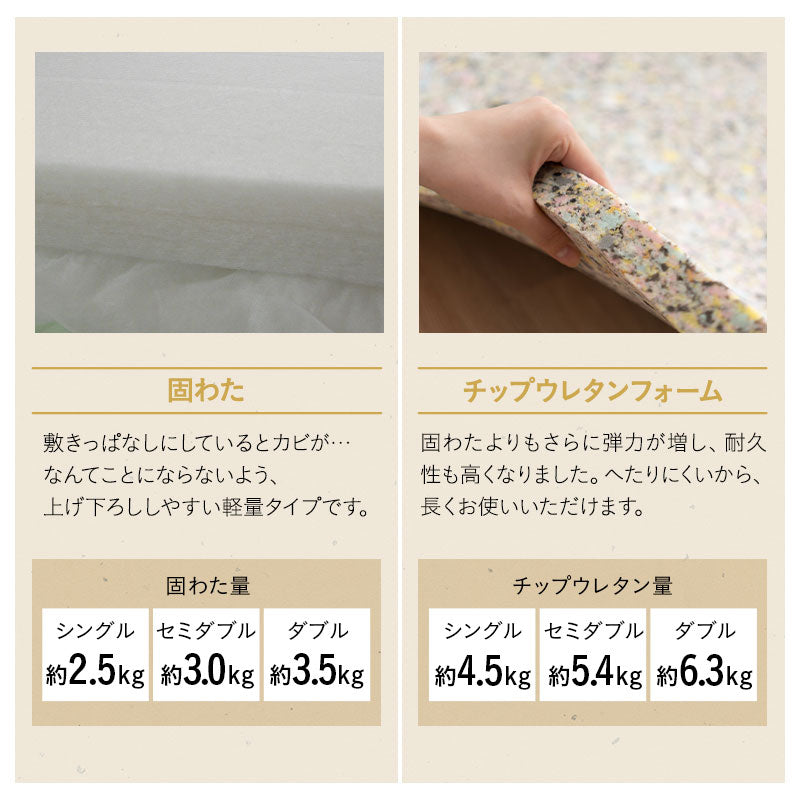 組成 | ■固わたタイプ 生地:綿100%(200本ブロード) 中芯:ポリエステル固わた 約3.0kg ■チップウレタンタイプ 生地:綿100%(200本ブロード) 中芯:チップウレタンフォーム 約5.4kg |