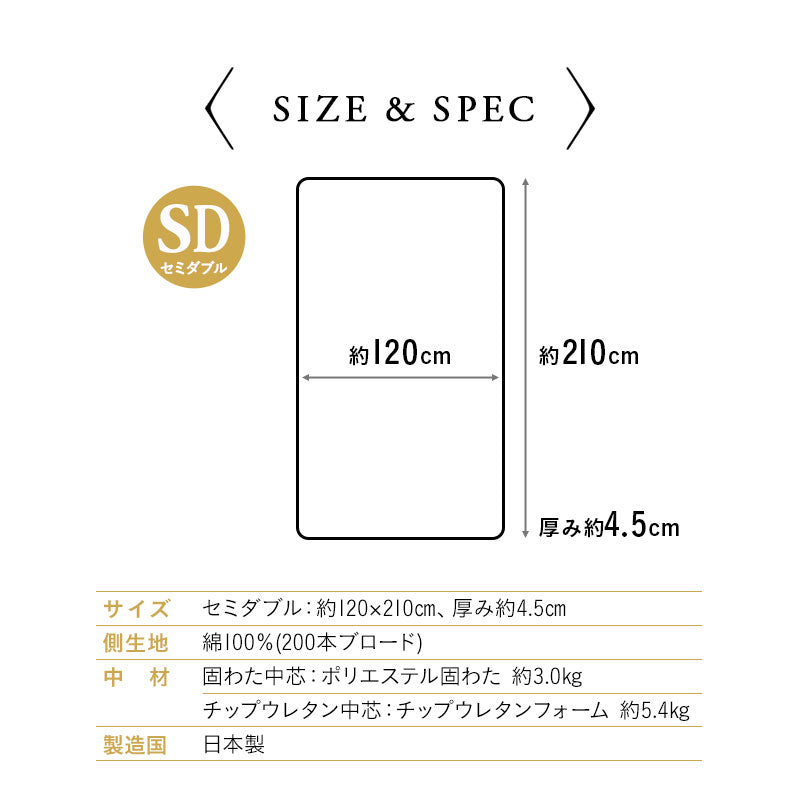 サイズ | セミダブルサイズ:約幅120×奥行210×厚さ4.5cm |