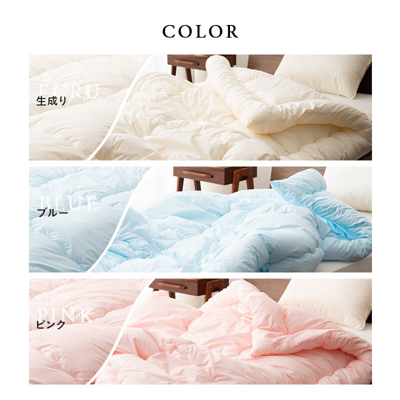 弾力性と軽さに優れた東レft®わたを使用し、速乾性に優れ、わたホコリも出にくいのが特長です。