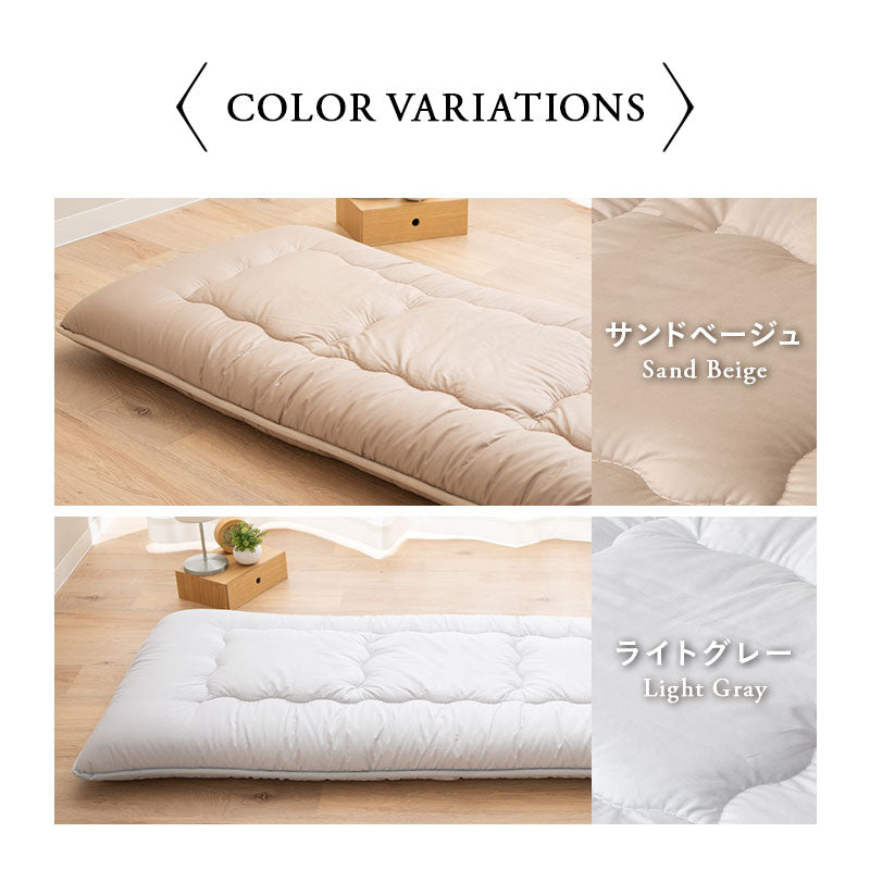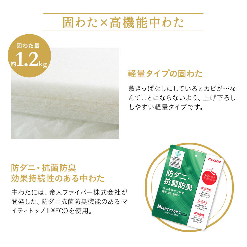 固わたタイプ | 生地:綿100%(200本ブロード) 中芯:ポリエステル固わた 約1.2kg 中わた:ポリエステル100% (帝人マイティ―トップⅡ®ECO 50%使用) 約1.2kg 商品重量:約2.7kg |