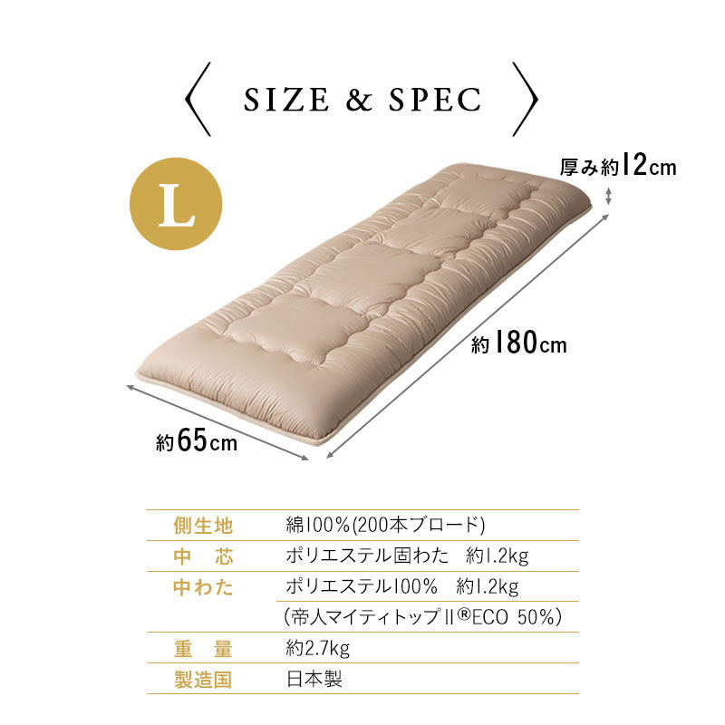 サイズ | Lサイズ:約幅65×奥行180×厚さ12cm ※裏面に生地のつなぎが入る場合がございます。ご理解・ご了承ください。 |