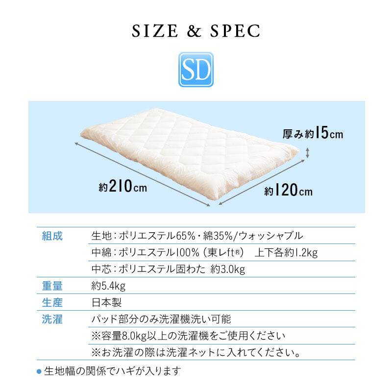 サイズ | セミダブルサイズ:約120×210×15cm |
