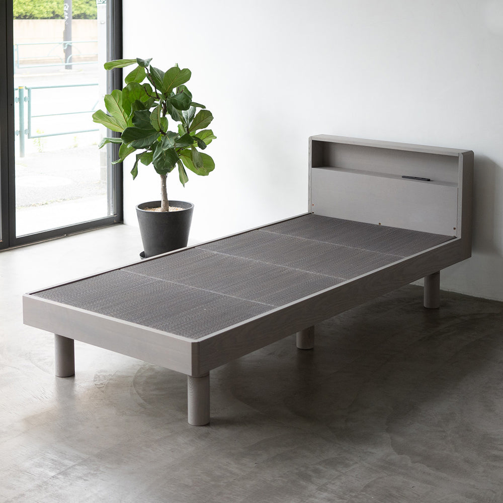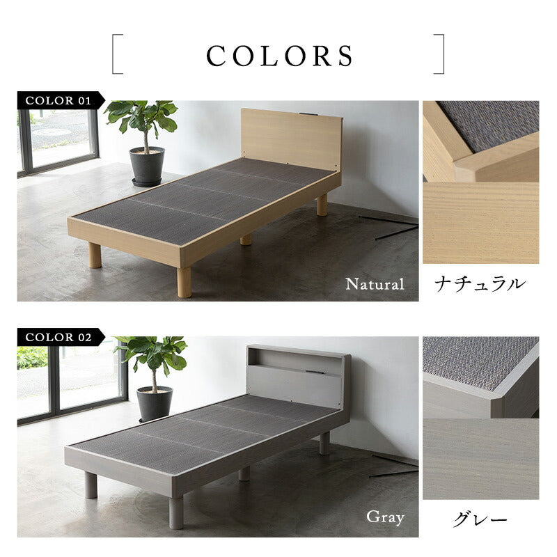 素材 | 脚/フットボードの上の辺と側面:タモ無垢材(ウレタン樹脂塗装) その他フレーム:タモ天然木化粧繊維板(ウレタン樹脂塗装) すのこ:桐無垢材 い草畳(表):天然い草 い草畳(芯材):ポリエステル100% い草畳(裏):ポリエステル100%(滑り止め付き) |