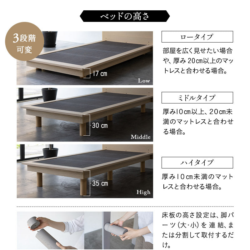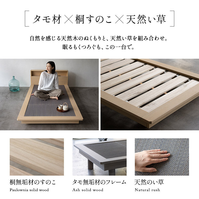 タモ材・桐すのこ・天然い草の組み合わせで、自然のぬくもりと空気の心地よさを楽しめます。