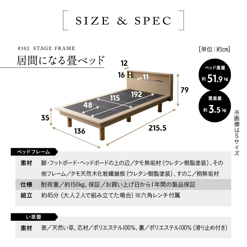 ■サイズ セミダブルサイズ:約幅136×奥行215.5×高さ79cm 床板の高さ:約17/30/35cm(3段階調節) 畳の厚さ:約1.5cm ■組成 脚/フットボードの上の辺と側面:タモ無垢材(ウレタン樹脂塗装) その他フレーム:タモ天然木化粧繊維板(ウレタン樹脂塗装) すのこ:桐無垢材 い草畳(表):天然い草 い草畳(芯材):ポリエステル100% い草畳(裏):ポリエステル100%(滑り止め付き) ■商品重量 フレーム:約51.9kg い草畳(4枚合計):約3.5kg ■耐荷重 約150kg ■組立所要時間 約45分 ※組立時、軍手と敷物があると便利です。(お客様でご準備ください。) ※大人2人以上での組み立てを推奨しております。 ※移動の際は大人2人以上で持ち上げるようにしてください。 ※ベッド移動時は、必ず長辺を持ち上げてください。 |