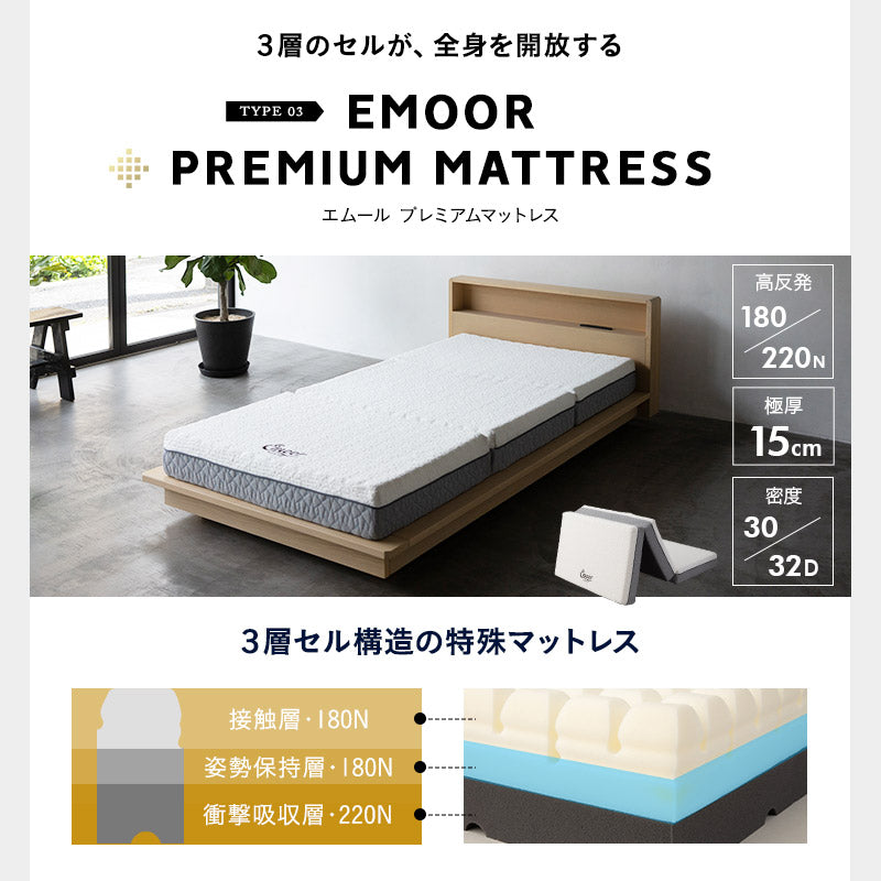 ■サイズ セミダブルサイズ:約幅120×奥行195×厚さ15cm ■組成 側生地(表面):ポリエステル100%(膨れニット生地) 側生地(側面):ポリエステル100%(ニット生地) 側生地(底面):ポリエステル100%(ハニカムメッシュ生地) インナーカバー:ポリエステル100%(メッシュ生地) 中材(1・2層目):高反発ウレタンフォーム 密度30kg/m³ 180N 中材(3層目):高反発ウレタンフォーム 密度32kg/m³ 220N ■お手入れ方法 側生地:取り外して洗濯機洗い可能(洗濯ネット使用推奨) |