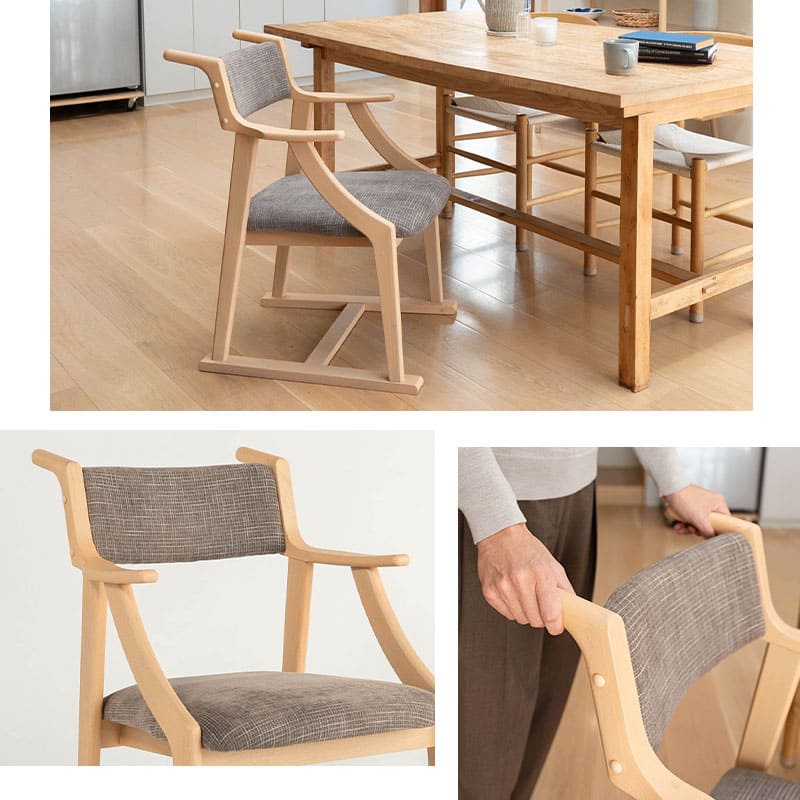フレームには割れにくく丈夫な楡(ニレ)の無垢材を使用。シートには落ち着いた風合いの生地を組み合わせ、和洋どちらのインテリアにも馴染むデザインです。