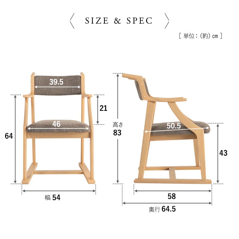 | サイズ | 全体:約幅54×奥行64.5×高さ83cm 座面:約幅46×奥行50.5×高さ43cm 肘の高さ:約64cm 背もたれ:約幅39.5×長さ17cm ※計測する位置や角度により、若干の誤差が生じる場合があります。 |