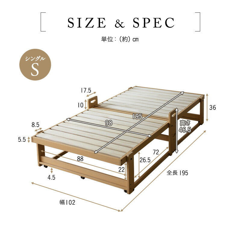 サイズ | シングルサイズ:約幅102×奥行195×高さ36cm (折りたたみ時:約幅102×奥行19×高さ126cm) 持ち手の高さ:約46.5cm |