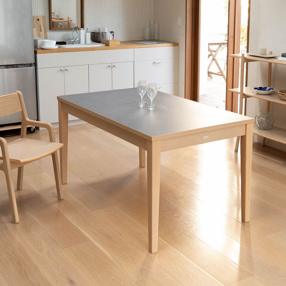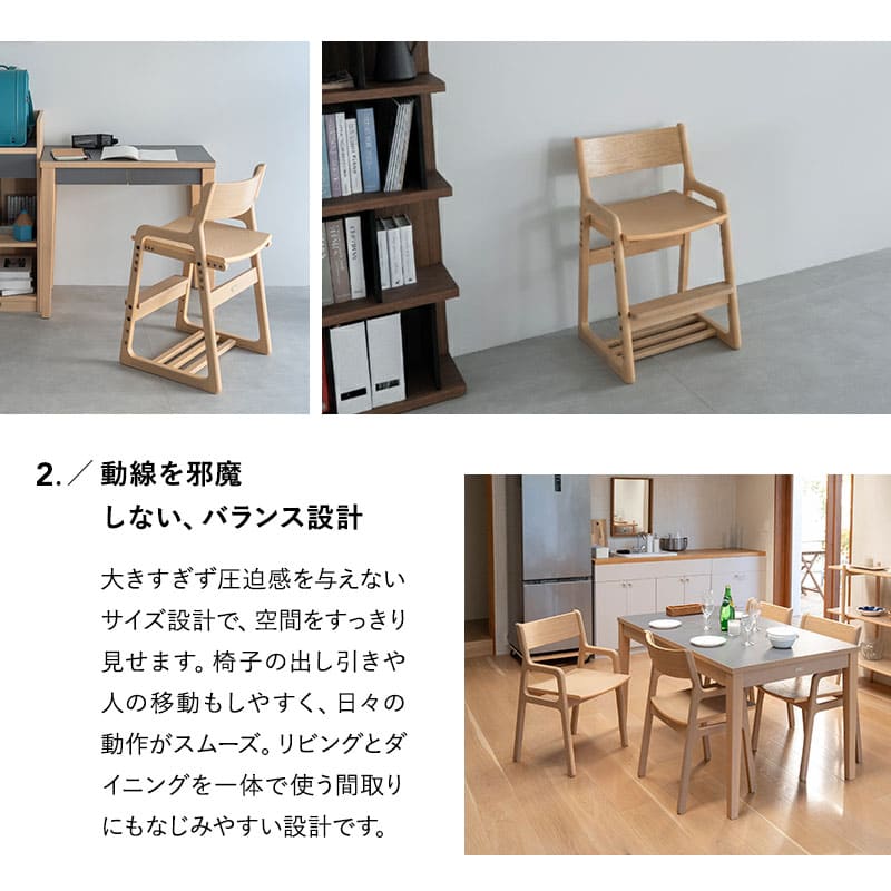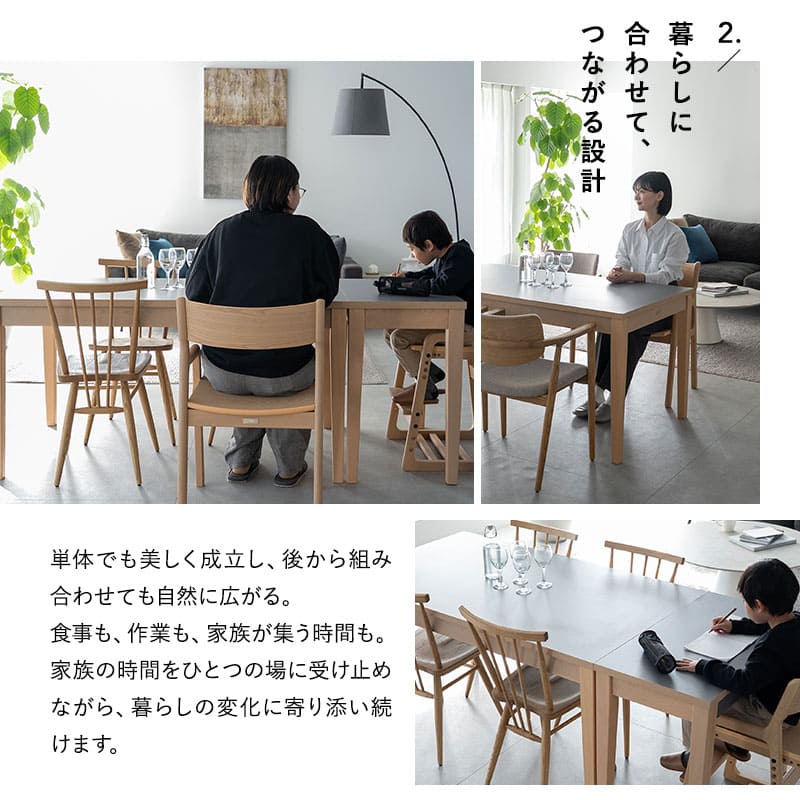 約135×80cmの天板は4人で広々と使え、食事だけでなく、学習や作業まで、多用途に活躍します。来客時には6人まで対応可能。