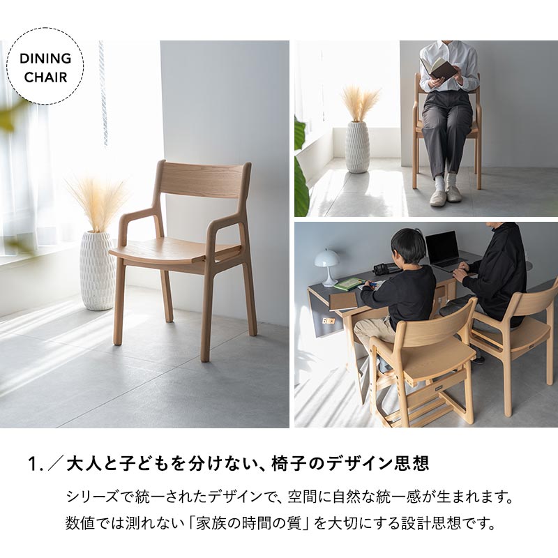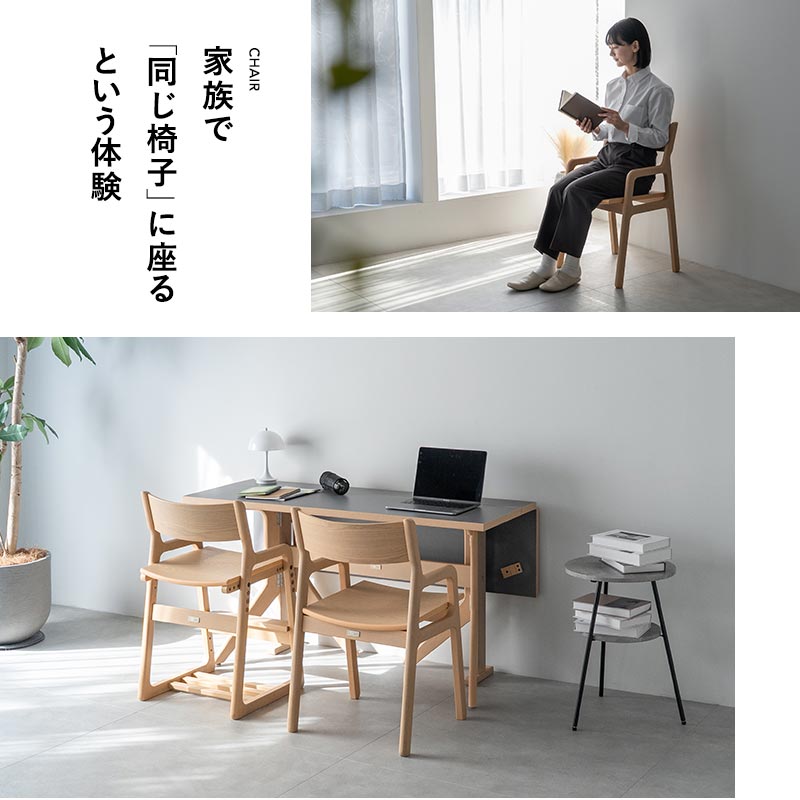 座面と足置きの高さを細かく調節できるチェアは、成長に合わせて無理なくフィットし、家族で長く使い続けられます。