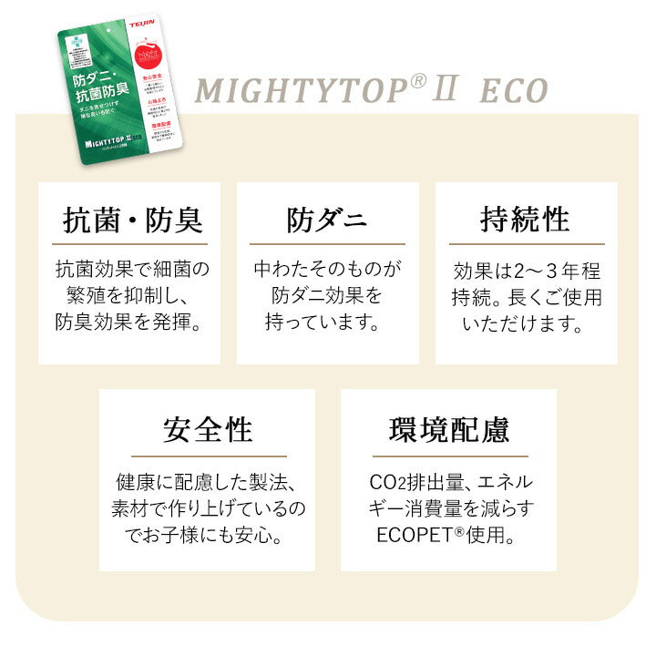 抗菌・防臭・防ダニの高機能わたと綿100%の側生地で、快適な寝心地とお手入れ性も抜群です。