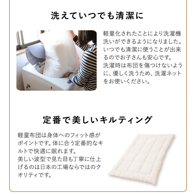 春夏用の掛布団は綿量0.4kgで洗濯機で丸洗いでき、清潔に保てる実用的なアイテムです。