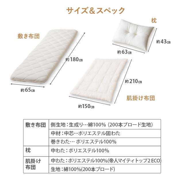 ■掛け布団 約150×210cm ※6ヶ所ループ付き 中わた:ポリエステル100%(帝人マイティトップ2 ECO、50%使用)(約0.4kg) 生地:綿100%(200本ブロード) ■敷き布団 約65cm×180cm 中芯:ポリエステル固わた 約1.2kg 巻きわた:ポリエステル100% 約1.2kg(帝人マイティトップ2 ECO、50%使用) 総重量:約2.7kg 生地:綿100% 200本ブロード生地 ■枕 約43×63cm(約0.4kg) 中わた:ポリエステル100% 生地:綿100% 200本ブロード生地 |