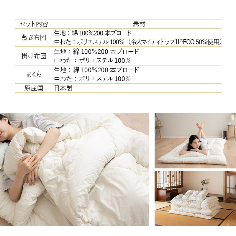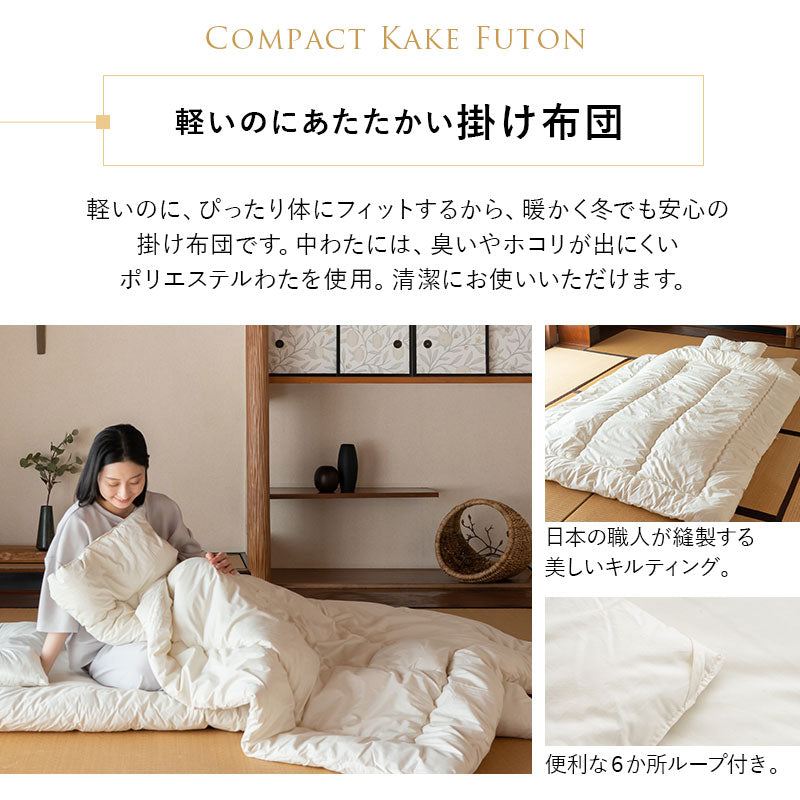 掛け布団 | シングルサイズ:約幅150×奥行200cm ※6ヶ所ループ付き 生地:綿100%(200本ブロード生地) 中わた:ポリエステル100%(帝人マイティトップⅡ®ECO 50%使用) わた重量:約1.2kg |