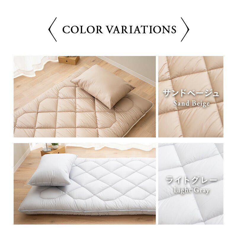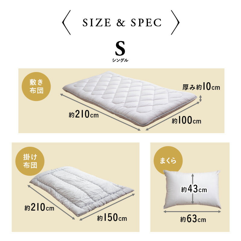 極厚の敷き布団、抗菌防臭わた入り掛け布団、手作り枕の充実したセット内容です。
