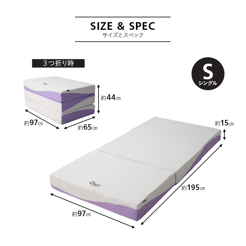 | サイズ | シングルサイズ:約幅97×奥行195×厚さ15cm (折りたたみ時:約幅97×奥行65×高さ44cm) |