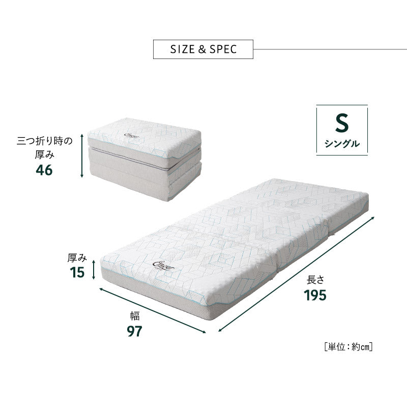 サイズ | シングルサイズ:約幅97×奥行195×厚さ15cm (折りたたみ時:約幅97×奥行66×厚さ46cm) |