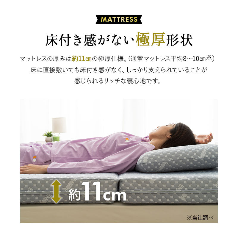 反発力200Nの硬めウレタンと11cm厚さで、安定感とスムーズな寝返りを両立した快適仕様です。
