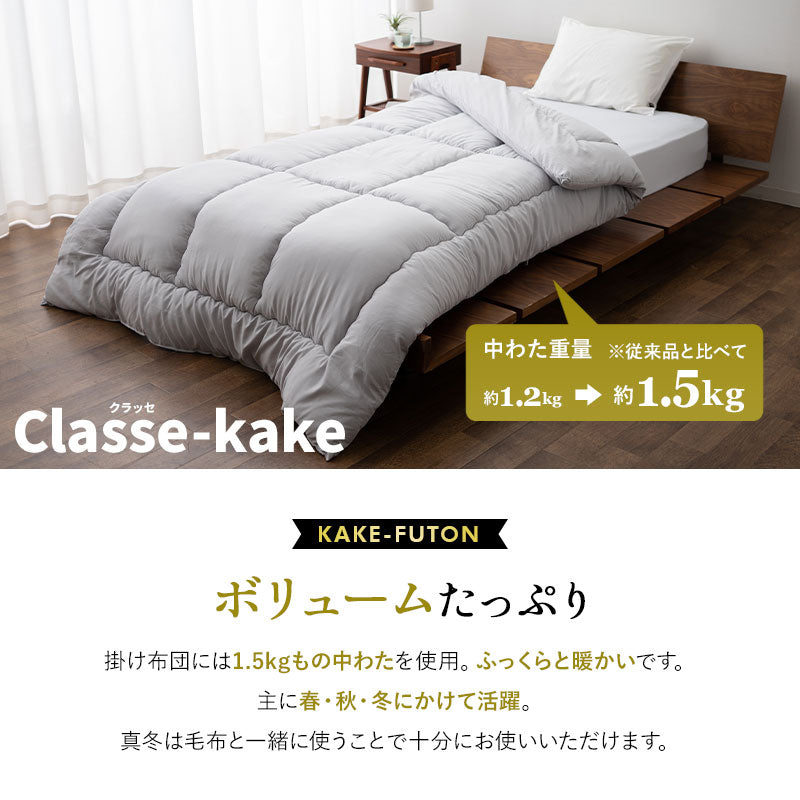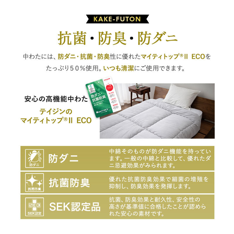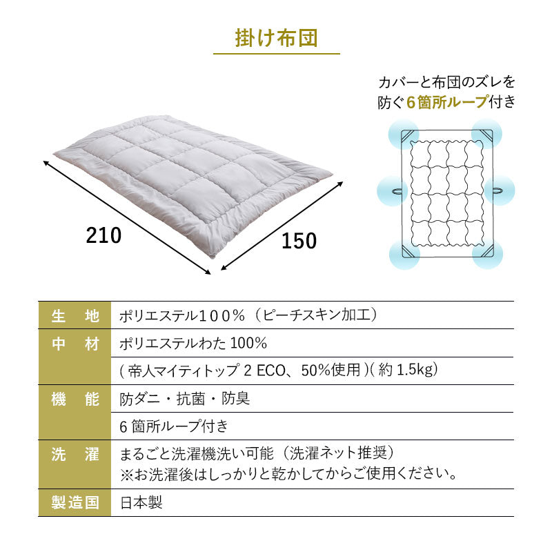 掛け布団 | ■サイズ シングルサイズ:約幅150×奥行210cm ※6ヶ所ループ付き ■組成 生地:ポリエステル100%(ピーチスキン加工) 中わた:ポリエステル100%(帝人マイティトップ®ⅡECO 50%使用) わた重量:約1.2kg ■お手入れ方法 洗濯機で丸洗い可能 ※洗濯ネット使用推奨 ※お洗濯後は、十分に干してからお使いください。 |