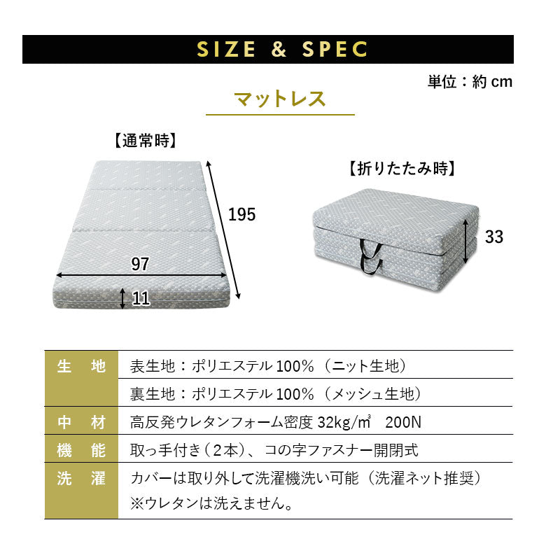 マットレス | ■サイズ シングルサイズ:約幅97×奥行195×厚さ11cm ■組成 表生地:ポリエステル100%(ニット生地) 裏生地:ポリエステル100%(メッシュ生地) 中材:高反発ウレタンフォーム(32D/200N) ■お手入れ方法 カバーのみ洗濯機洗い可能 ※洗濯ネット使用推奨 |