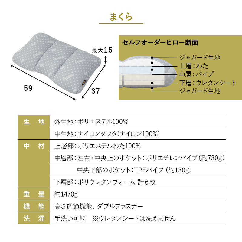 枕 | ■サイズ 約幅59×奥行37×高さ(最大)15cm ■組成 外生地:ポリエステル100% 中生地:ナイロン100%(ナイロンタフタ) 中材(上層部):ポリエステルわた100% 中材(中央上部/左右):ポリエチレンパイプ 約730g 中材(中央下部):TPEパイプ 約130g 中材(下層部):ポリウレタンフォーム 計6枚 ■お手入れ方法 手洗い可能 ※ウレタンシートは洗えません。 |