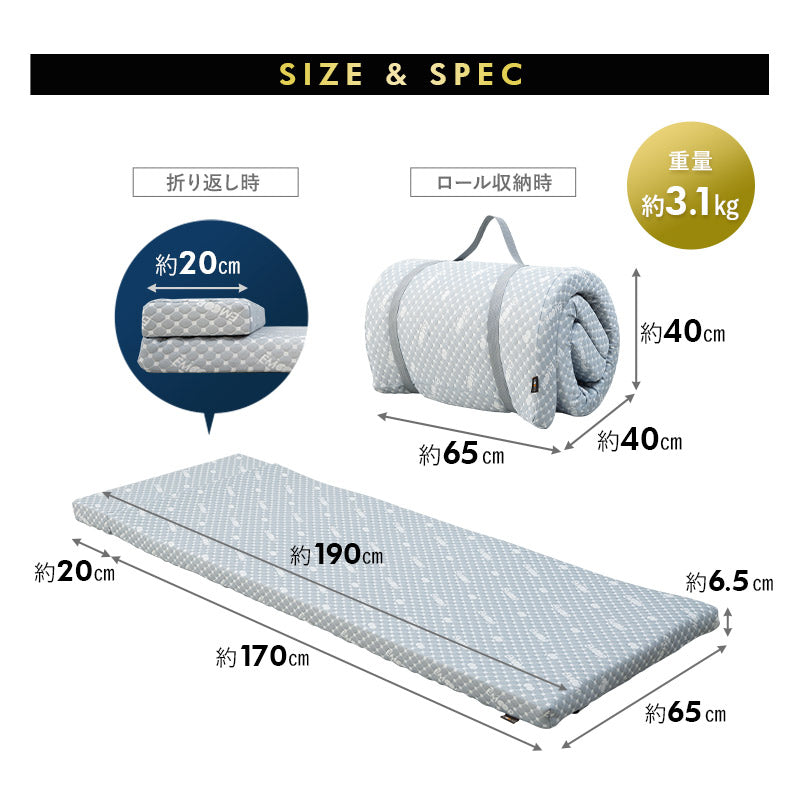 サイズ | スリムサイズ:約幅65×奥行190×厚さ6.5cm 折り返し時:約幅65×奥行170×厚さ6.5cm ロール収納時:約幅65×奥行40×高さ40cm |