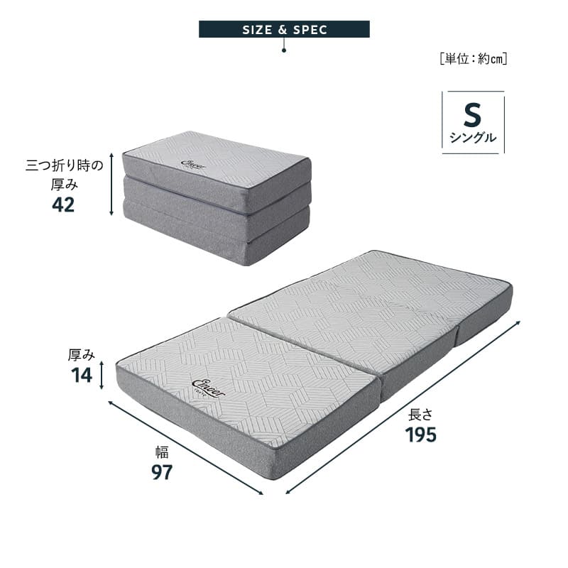 サイズ | シングルサイズ:約幅97×奥行195×厚さ14cm (折りたたみ時:約幅97×奥行66×厚さ42cm) |