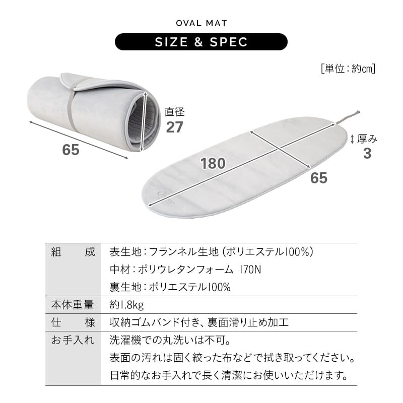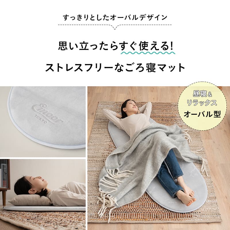 くるっと巻いて手軽に収納できる省スペース設計で、見た目もすっきりとしたオーバル型ごろ寝マットです。