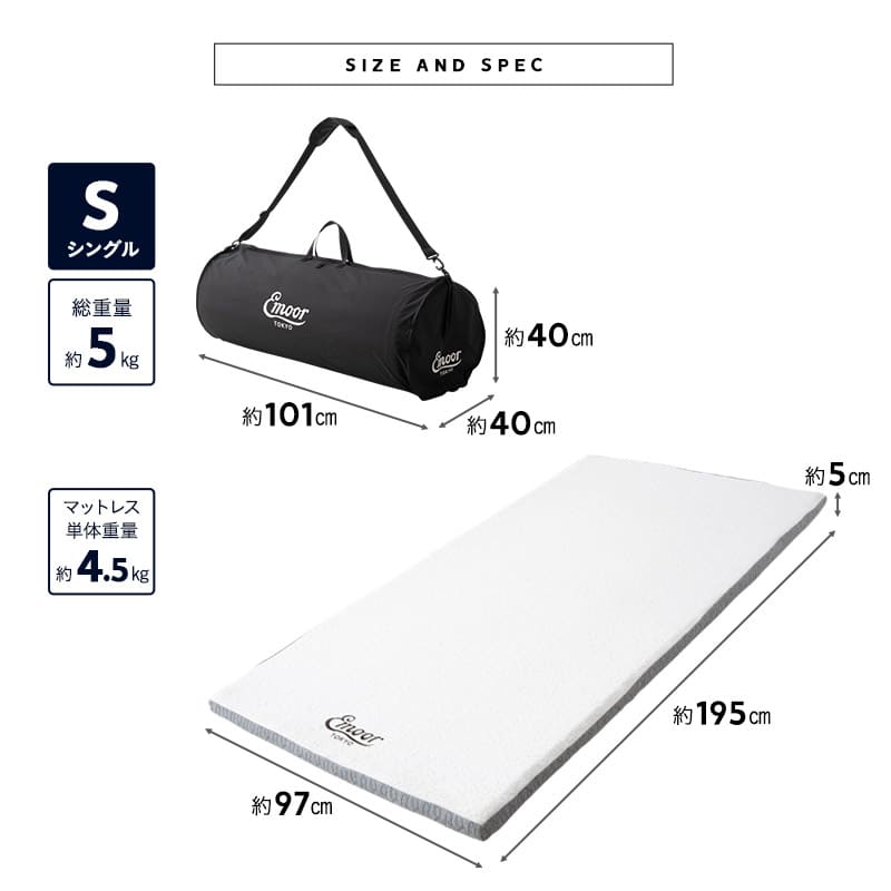 サイズ | シングルサイズ:約幅97×奥行195×厚さ5cm 専用バッグ収納時:約幅101×奥行50×高さ40cm |