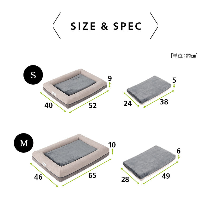 寸法 | ■Sサイズ 全体:約幅52×奥行40×高さ9cm マットレス:約幅38×奥行24×厚さ5cm ■Mサイズ 全体:約幅65×奥行46×高さ10cm マットレス:約幅49×奥行28×厚さ6cm ■Lサイズ 全体:約幅85×奥行60×高さ11cm マットレス:約幅65×奥行40×厚さ7cm |