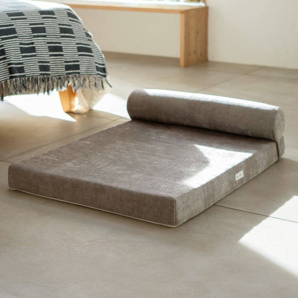 ワンちゃんの好みに合わせて使用できる枕は、面テープで簡単取り付け。枕の中材は、適度に沈み込むもっちり柔らかな低反発で、腕やアゴ乗せしてリラックス。
