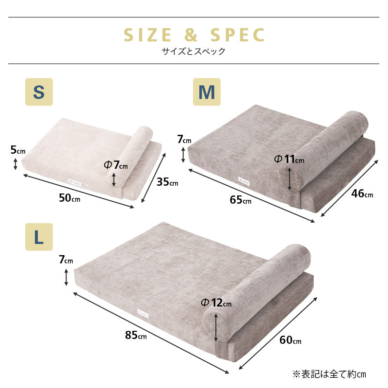 | 寸法 | ■Sサイズ マットレス:約幅50×奥行35×厚さ5cm 枕:約直径7×長さ35cm ■Mサイズ マットレス:約幅65×奥行46×厚さ7cm 枕:約直径11×長さ46cm ■Lサイズ マットレス:約幅85×奥行60×厚さ7cm 枕:約直径12×長さ60cm |