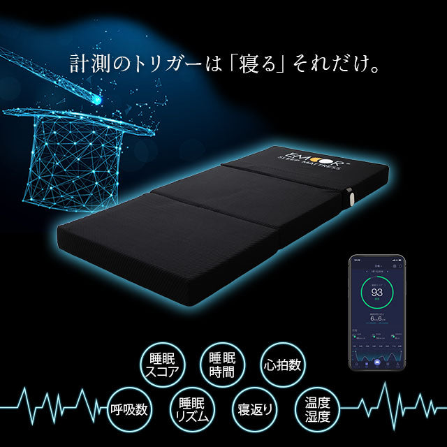 ジャンル | 新世代型マットレス 折りたたみマットレス 高反発マットレス ウレタンマットレス ベッドマットレス 高反発マット ベッドマット 折りたたみ 折り畳み 高反発ウレタン 高反発 ウレタン 三つ折り 3つ折り マットレス マット 敷き布団 敷布団 布団 ベッド 寝具 シングルサイズ シングル EMOOR SLEEP MATTRESS with SLEEP TRACKER エムールスリープマットレス スリープマットレス 睡眠 時間 リズム 心拍 呼吸 寝返り 湿度 温度 計測 可視化 簡単 手軽 専用アプリ 極厚 厚さ 12cm 硬め かため 洗えるカバー 洗える カバー 通気性 肩こり 腰痛 体圧分散 快眠 コンパクト 収納 新生活 一人暮らし 送料無料 エムール |