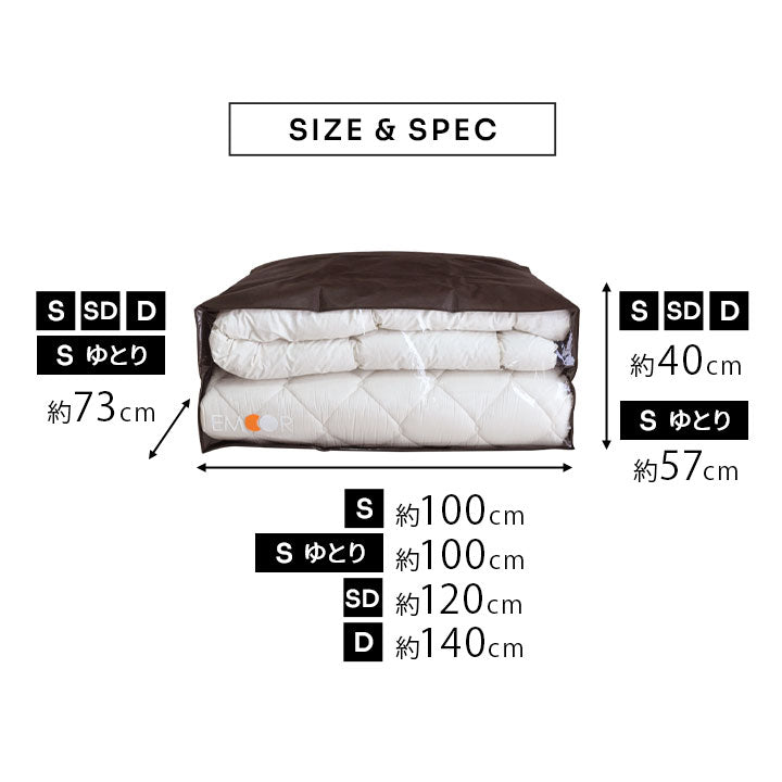 収納目安 | ■シングルサイズ シングルサイズの掛け布団・敷き布団・枕1~2個程度 ■シングルゆとりサイズ シングルサイズの掛け布団・敷き布団・枕1~2個・布団カバーや毛布2点程度 ■セミダブルサイズ セミダブルサイズの掛け布団・敷き布団・枕1~2個程度 ■ダブルサイズ ダブルサイズの掛け布団・敷き布団・枕1~2個程度 |