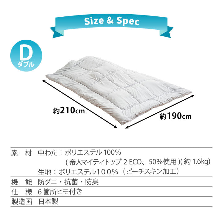 素材 | 生地:ポリエステル100%(ピーチスキン加工) 中わた:ポリエステル100%(帝人マイティトップ®ⅡECO 50%使用) 約1.6kg |