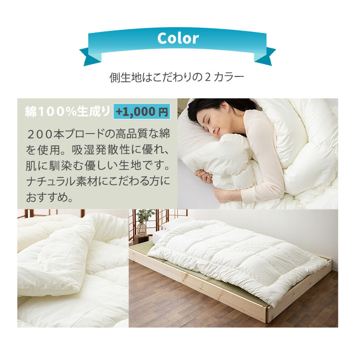 素材 | ■生地 ポリエステルグレー:ポリエステル100%(ピーチスキン加工) 綿100%生成り:綿100%(200本ブロード) ■中わた ポリエステル100%(帝人マイティトップ®ⅡECO 50%使用) ■中わた量 ポリエステルグレー:約1.2kg 綿100%生成り:約1.5kg |