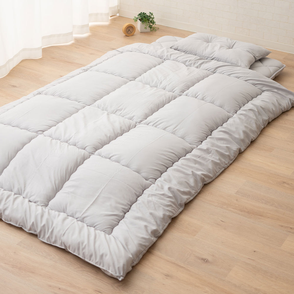 かけ布団は、抗菌・防臭・防ダニ機能付きで約50%高品質中わたを使用し、家庭で洗える仕様です。