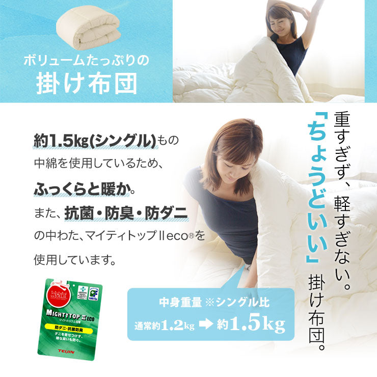 掛け布団は抗菌防臭防ダニのマイティトップ2わたをたっぷり1.5kg使用し、暖かくふっくら仕上げました。