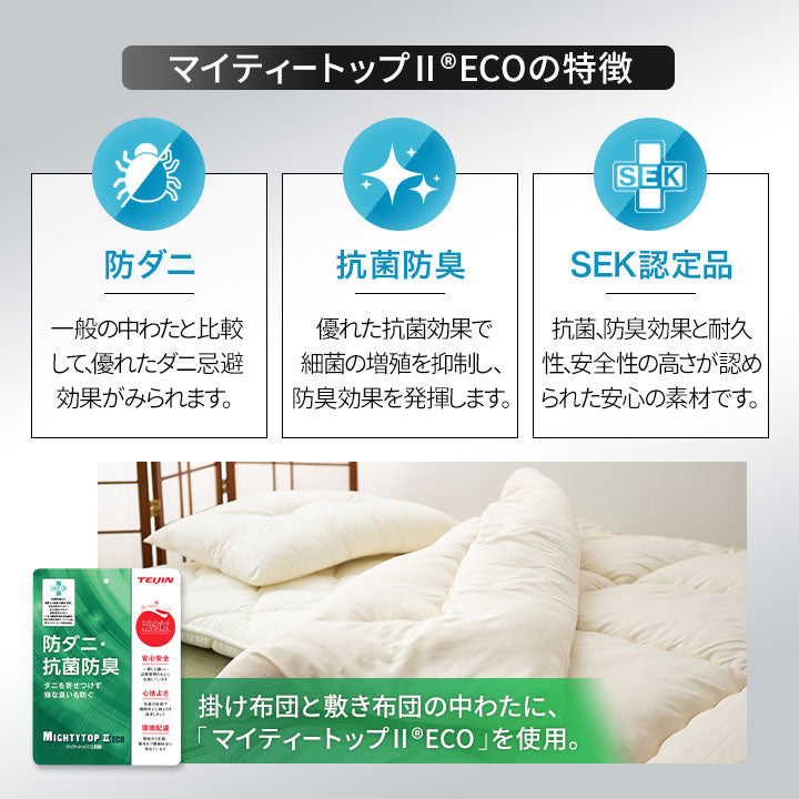 中わたには抗菌防臭・防ダニ加工の高機能素材「マイティトップ」を使用しています。