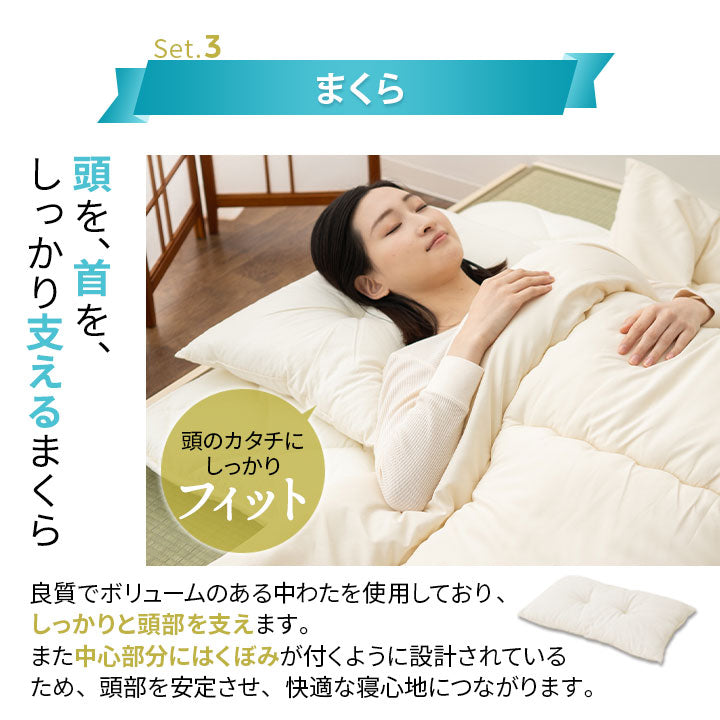 生産国 | 枕・掛け布団・敷き布団:日本製 / 布団カバー3点セット:中国製 |
