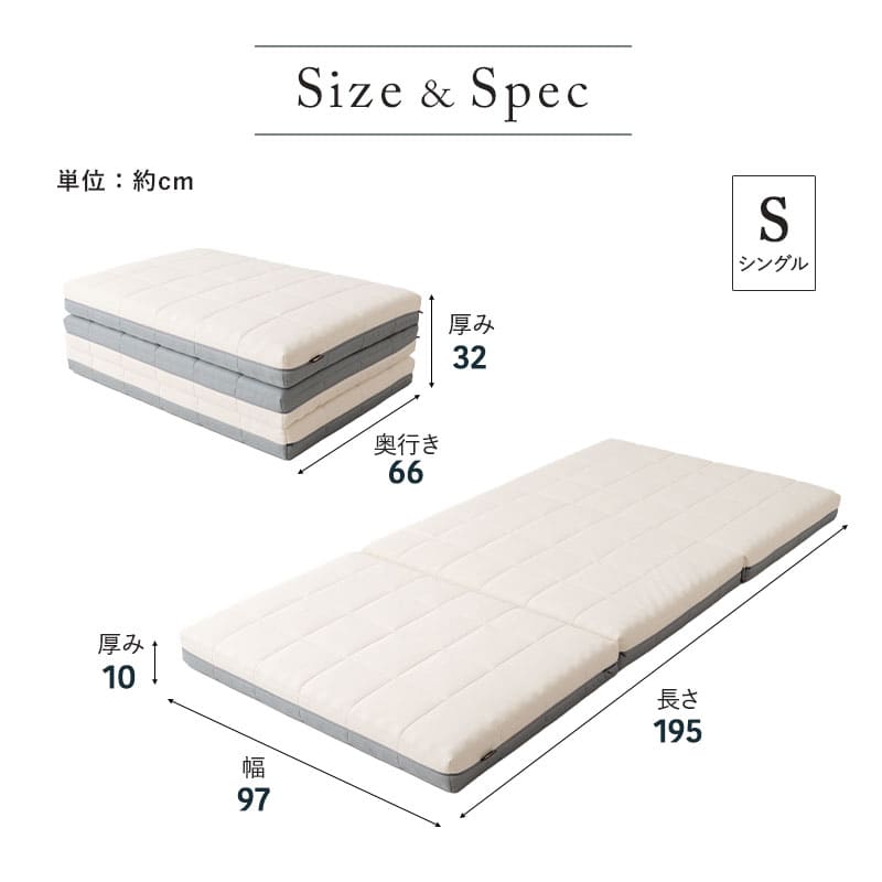 サイズ | シングルサイズ:約幅97×奥行195×厚さ10cm (折りたたみ時:約幅97×奥行66×高さ32cm) |