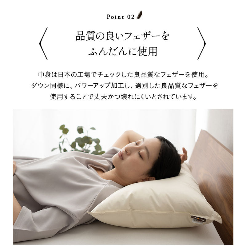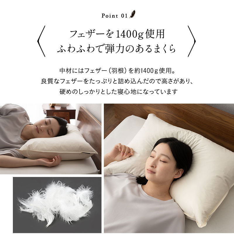 中材には約1400gもの良質なフェザーを使用し、高さと適度な硬さを実現しています。