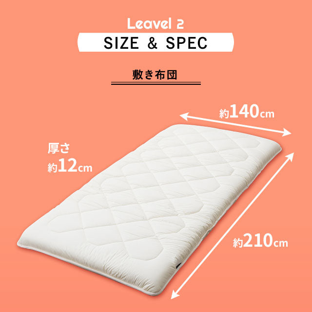 掛け布団:約幅190×奥行210cm ※こちらのサイズは生地幅より大きい幅になるため、生地のつなぎが入ります。ご理解・ご了承ください。 敷き布団:約幅140×奥行210×厚さ12cm |