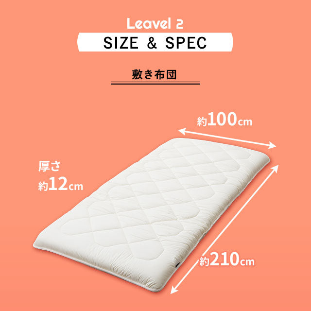 掛け布団:約幅150×奥行210cm ※こちらのサイズは生地幅より大きい幅になるため、生地のつなぎが入ります。ご理解・ご了承ください。 敷き布団:約幅100×奥行210×厚さ12cm |